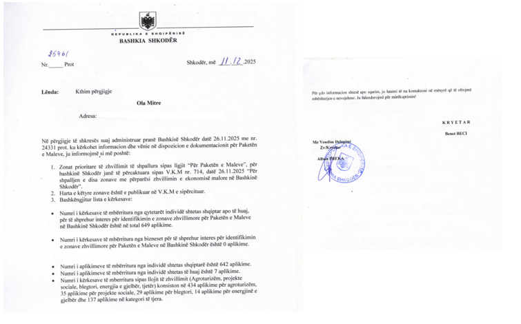 Interesi për të ndërtuar në zonat prioritare ka qenë tejet i lartë, sipas të dhënave të Drejtorisë së Planifikimit dhe Zhvillimit Territorial të Bashkisë Shkodër. Pas një kërkese për informacion, kjo drejtori bëri me dije se deri më 9 dhjetor 2025 ishin paraqitur 642 aplikime për 5 tipologjitë që lejonte sistemi i ngritur për këtë qëllim: Agroturizëm, energji e gjelbër, blegtori, projekte sociale dhe tipologjia “tjetër”, që le të hapur çdo lloj kërkese për investime. Pjesa më e madhe lidhej me agroturizimin (434), kategoria “të tjera” kishte 136 aplikime, projektet sociale 35, blegtoria 29 dhe energjia e gjelbër, pra ndërtimi i parqeve diellore dhe eolike, 14 aplikime.